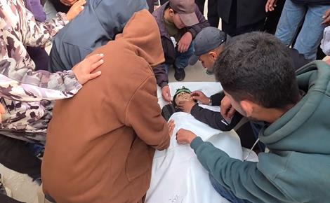 تشييع جثمان الشهيد الطفل ركان الطويل في مستشفى شهداء الاقصى بعد استهداف مقر بلدية دير...
