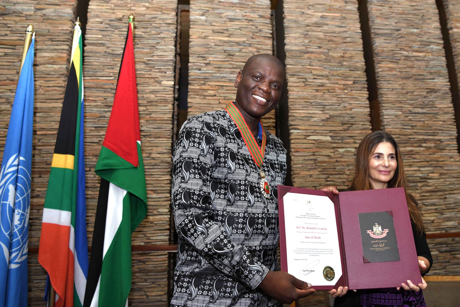 وقلدت السفيرة حنان جرار، الوزير لامولا وسام دولة فلسطين من نجمة الاستحقاق، نيابة عن الرئيس محمود عباس، لدوره المتميز في تعزيز العلاقات بين فلسطين وجنوب أفريقيا وتقديرا لدعمه الثابت لنضال الشعب الفلسطيني العادل من أجل الحرية والاستقلال.