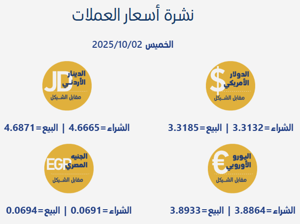 رام الله 2-10-2025 وفا- جاءت أسعار صرف العملات مقابل الشيقل الإسرائيلي، اليوم الخميس، بحسب سلطة النقد الفلسطينية، على النحو التالي:
