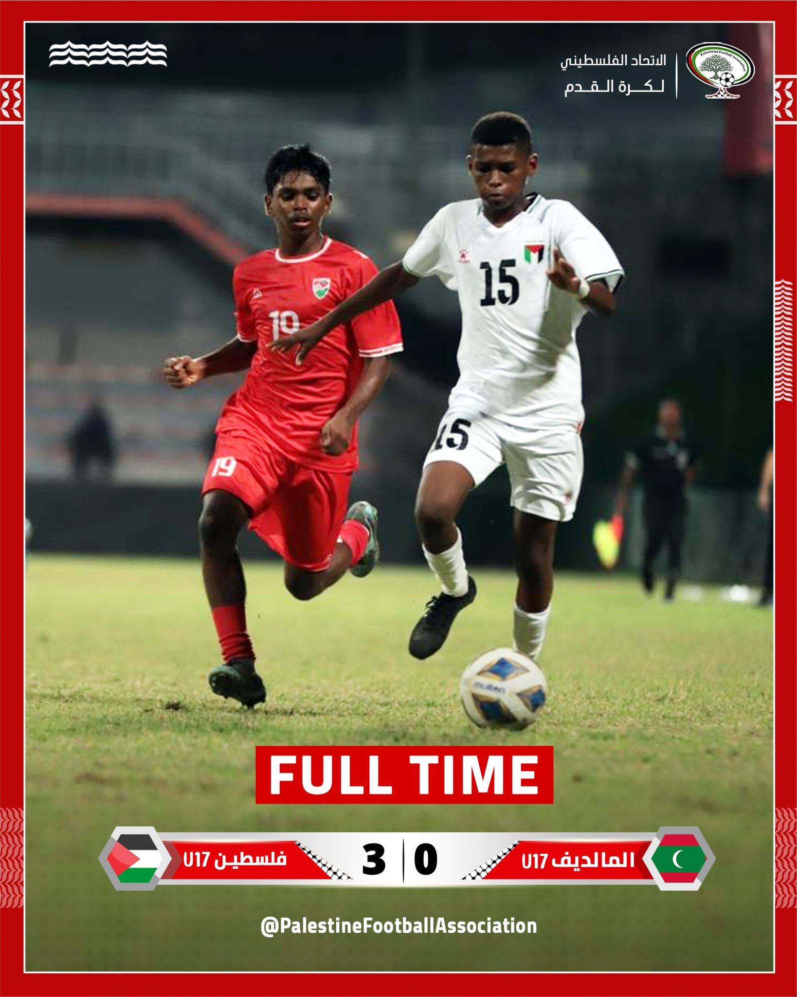 ماليه 15-11-2025 وفا- حقق منتخبنا للناشئين، مساء اليوم السبت، انتصارا كبيرا على ضيفه منتخب جزر المالديف بثلاثية نظيفة في لقاء ودي جمعهما في العاصمة ماليه، ضمن الاستعدادات لتصفيات كأس آسيا تحت 17 عاما.