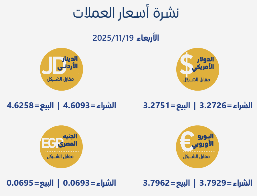 رام الله 19-11-2025 وفا- جاءت أسعار صرف العملات مقابل الشيقل الإسرائيلي، اليوم الأربعاء، بحسب سلطة النقد الفلسطينية، على النحو التالي: