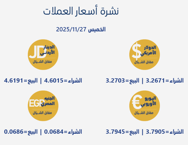 رام الله 27-11-2025 وفا- جاءت أسعار صرف العملات مقابل الشيقل الإسرائيلي، اليوم الخميس، بحسب سلطة النقد الفلسطينية، على النحو التالي: