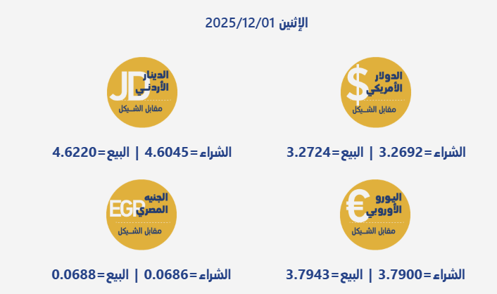 رام الله 1-12-2025 وفا- جاءت أسعار صرف العملات مقابل الشيقل الإسرائيلي، اليوم الإثنين، بحسب سلطة النقد الفلسطينية، على النحو التالي: