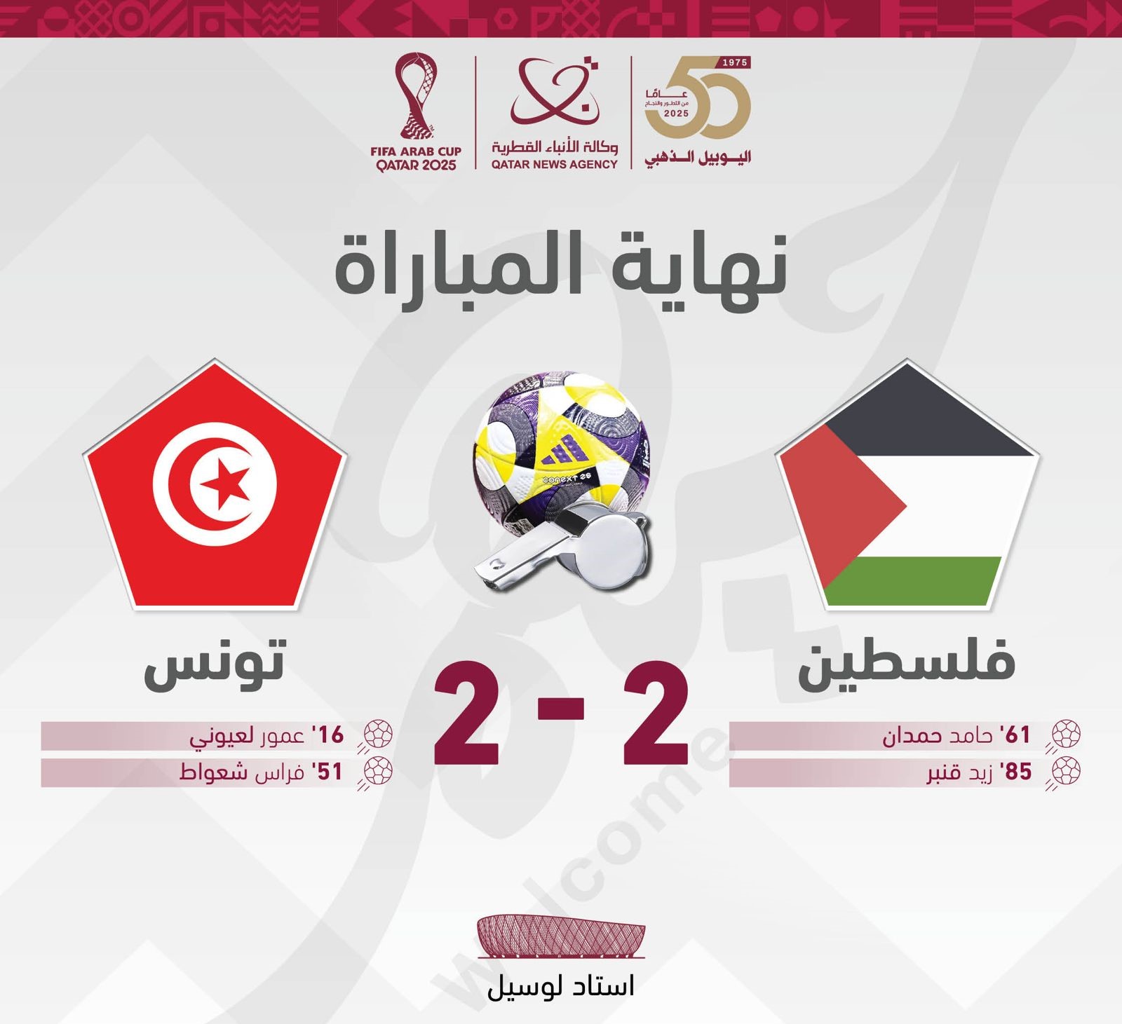 الدوحة 4-12-2025 وفا- قلب منتخبنا الوطني، مساء اليوم الخميس، تأخره امام شقيقه التونسي بهدفين نظيفين الى تعادل مستحق في بطولة كأس العرب لكرة القدم.