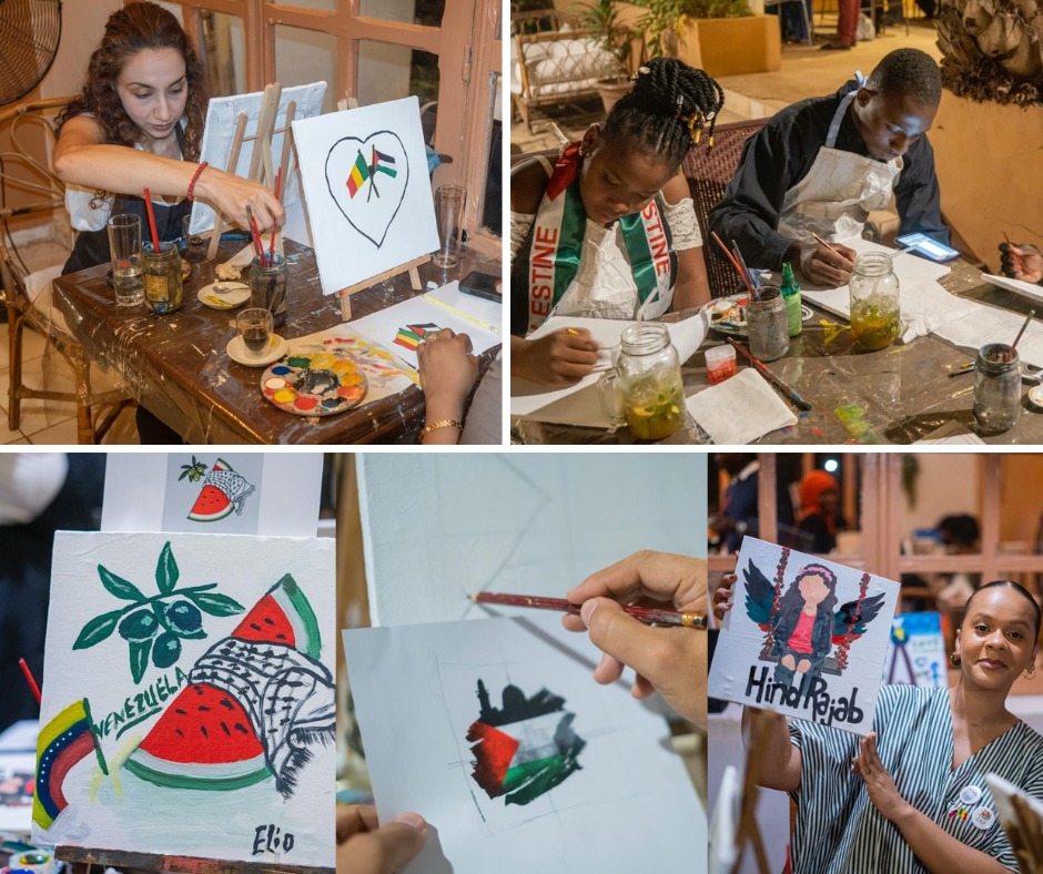 وأقيمت الورشة في أحد مقاهي باماكو، حيث شارك الحاضرون في رسم لوحات تعبّر عن التضامن مع فلسطين، ومع أطفال غزة بشكل خاص.