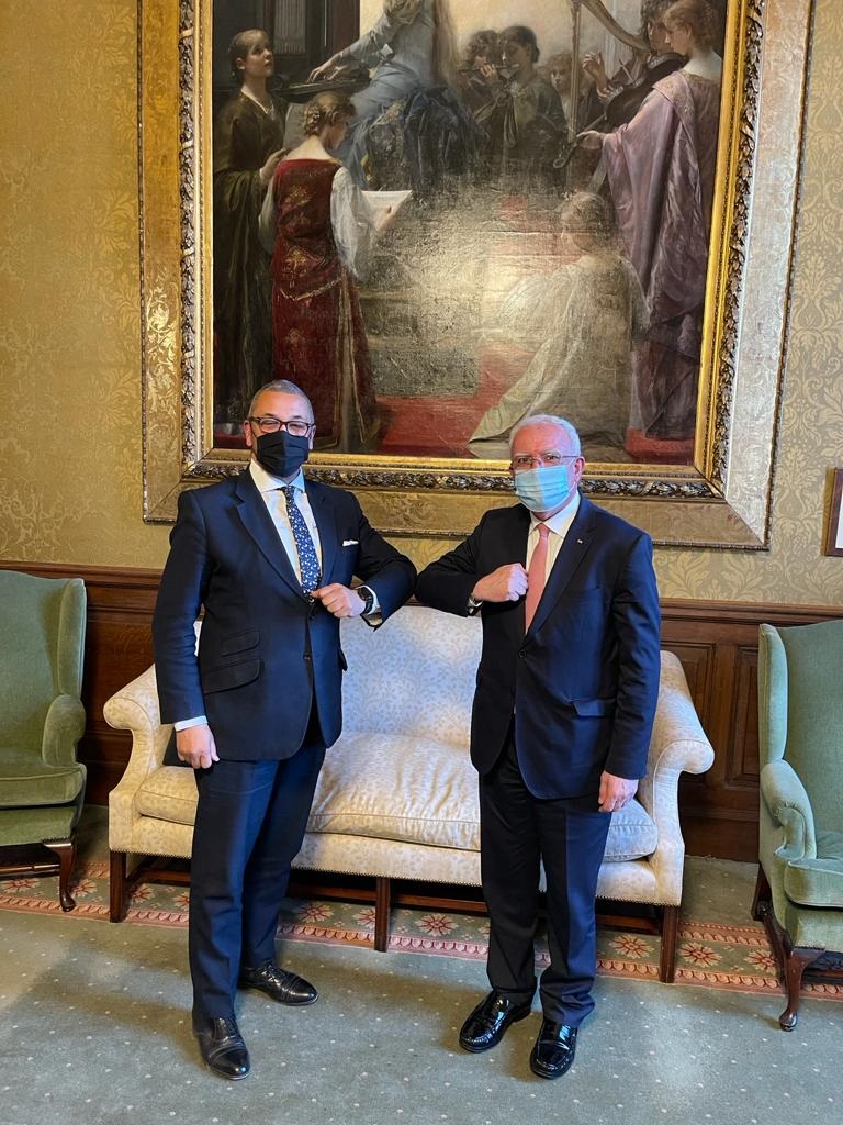 لندن 22-4-2021 وفا- التقى وزير الخارجية وشؤون المغتربين رياض المالكي اليوم الخميس، بوزير الخارجية والتنمية البريطانية دومينيك راب، وبوزير الدولة لشؤون الشرق الأوسط جيمس كليفرلي، كل على حده، في العاصمة البريطانية لندن.
