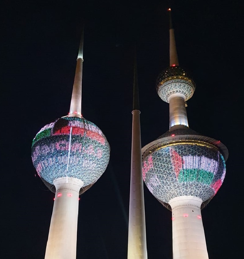 الكويت 19-5-2021 وفا- جرى، اليوم الأربعاء، إضاءة أبراج الكويت بعلم فلسطين، تضامنا مع شعبنا، حيث من المقرر أن يستمر ذلك طوال فترة الحملة الشعبية التي أطلقتها الكويت اليوم لإغاثة فلسطين تحت شعار "نحن بجانبكم"، والتي ستستمر لمدة شهر.