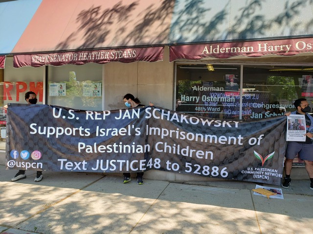 واشنطن 10-6-2021 وفا- اعتصم أعضاء من تحالف شيكاغو ضد العنصرية اليوم الخميس، أمام مكتب عضو الكونغرس الأميركي عن ولاية الينوي يان شاكوسكي احتجاجا على دعمه إسرائيل.