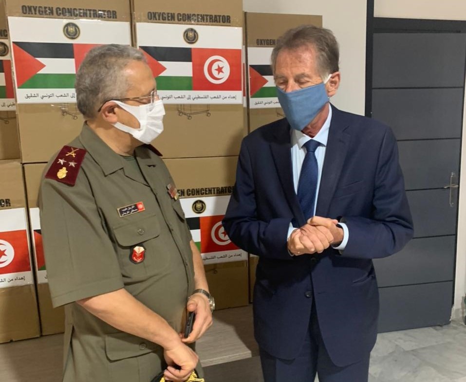 تونس 9-8-2021 وفا- بتوجيهات من رئيس دولة فلسطين محمود عباس، سلّم سفير دولة فلسطين لدى تونس هائل الفاهوم، اليوم الاثنين، 50 جهاز مكثِّف أكسجين لإدارة الصحة العسكرية بالمستشفى العسكري في تونس.