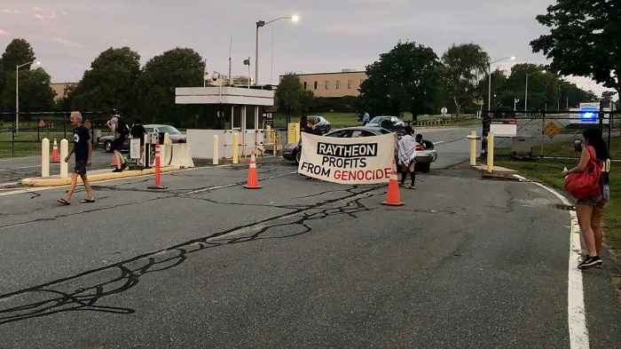 واشنطن 13 -8-2021 وفا- أغلق متضامنون أميركيون مع الحق الفلسطيني، مداخل شركة "رايثيون" المصنعة للصواريخ الموجهة و"القبة الحديدية".