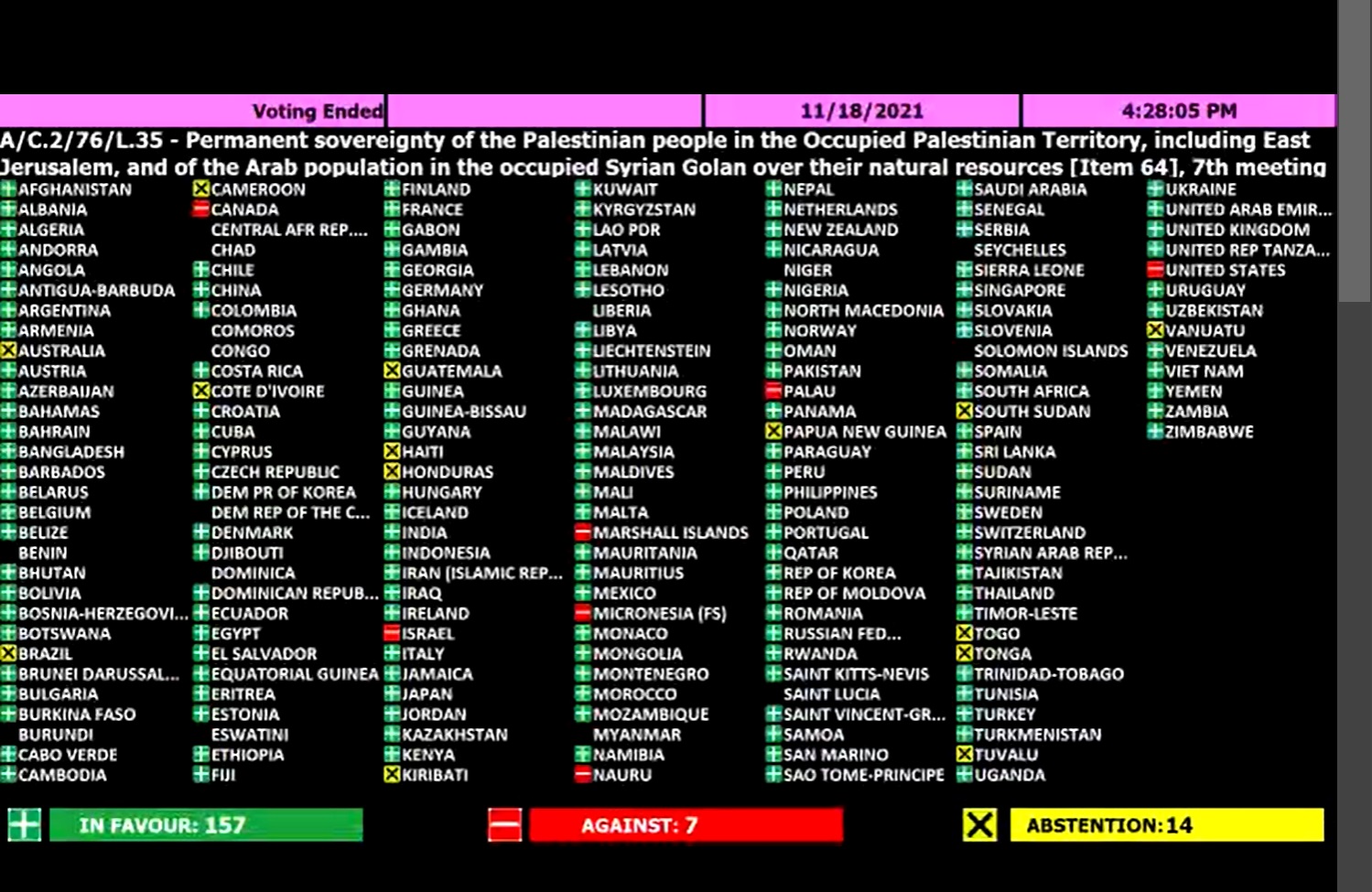 وصوت لصالح القرار 157 صوتا، فيما عارضته 7 دول (أمريكا، إسرائيل، كندا، ونايرو، ميكرونيزيا، جزر مارشال وبالاو)، وامتنعت 14 دولة عن التصويت.