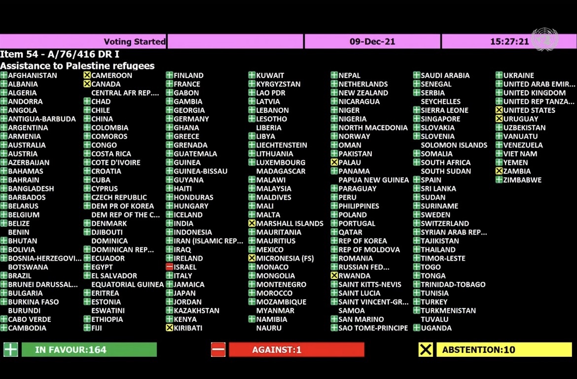 نيويورك 10-12-2021 وفا- اعتمدت الجمعية العامة للأمم المتحدة، خمسة قرارات متعلقة بالقضية الفلسطينية بأغلبية ساحقة، وعلى رأسها القرار المعني بالدعم للاجئي فلسطين، والذي يشمل ولاية الاونروا، حيث حاز على دعم 164 دولة في حين صوتت ضده اسرائيل فقط وامتنعت عن التصويت 10 دول ومنها الولايات المتحدة.