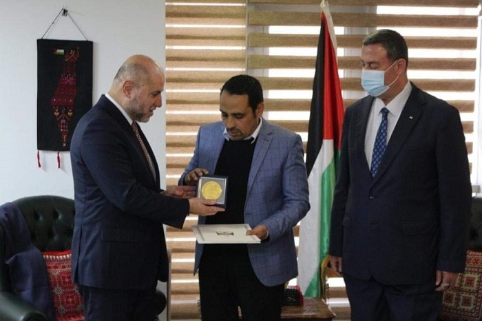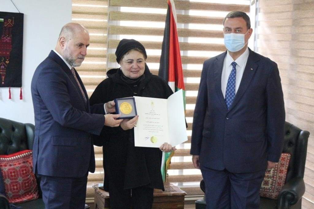 القاهرة 12-1-2022 وفا- نيابة عن سيادة الرئيس، قلّد قاضي قضاة فلسطين، مستشار الرئيس للشؤون الدينية والعلاقات الإسلامية محمود الهباش، وسفير دولة فلسطين لدى جمهورية مصر العربية ومندوبها الدائم لدى جامعة الدول العربية دياب اللوح، اليوم الأربعاء، في مقر السفارة بالقاهرة، باحثين وأكاديميين مصريين ميدالية الرئيس محمود عباس التذكارية، تقديرًا لجهودهما البحثية والأكاديمية المناصرة للقضية الفلسطينية.