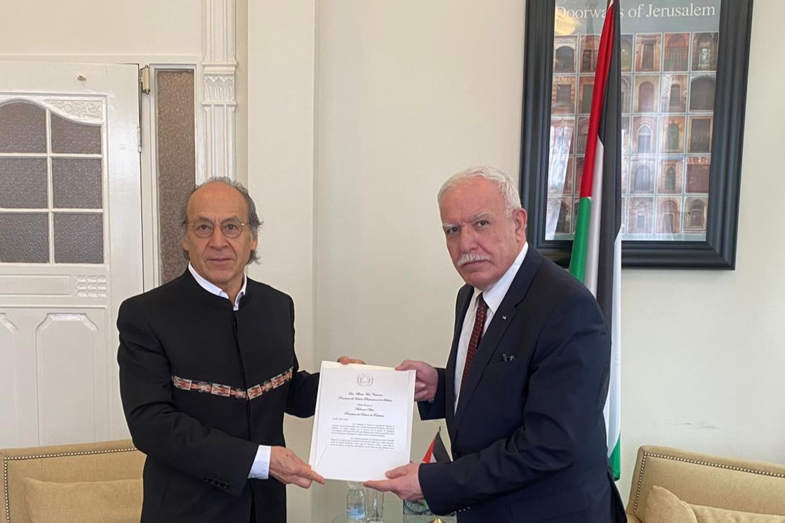 لاهاي 21-2-2024 وفا- تسلم وزير الخارجية والمغتربين رياض المالكي، اليوم الأربعاء، في مقر سفارة دولة فلسطين لدى مملكة هولندا، نسخة من أوراق اعتماد سفير دولة بوليفيا متعددة القوميات غير المقيم لدى دولة فلسطين، روبيرتو سراميينتو.
