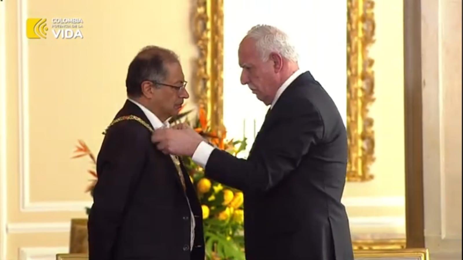 بوغوتا 4-6-2024 وفا- نيابة عن رئيس دولة فلسطين محمود عباس، قلد المبعوث الخاص للرئيس، مستشاره لشؤون العلاقات الدولية، رياض المالكي، رئيس جمهورية كولومبيا غوستافو بيترو، القلادة الكبرى لدولة فلسطين.
