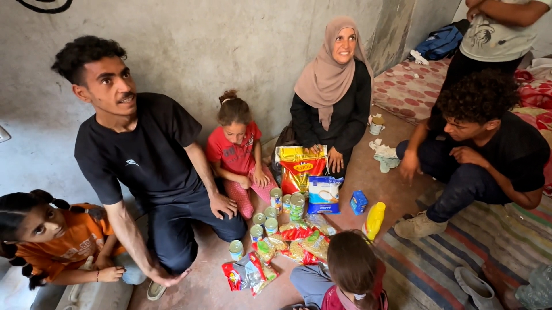 مواطنون يحملون أكياسًا من الطحين، بينما ينتظر آخرون دوروهم أمام نقطة توزيع مساعدات أنشأتها جمعية أنقذوا مستقبلكم المستقلة (SYFS)، بالتنسيق مع برنامج الأغذية العالمي التابع للأمم المتحدة (WFP)، في مدينة غزة.