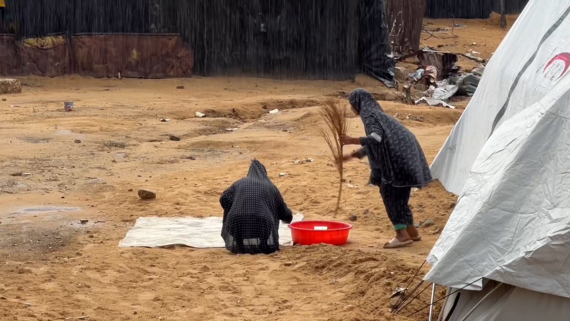 غزة: نساء الخيام يواجهن المطر والعاصفة