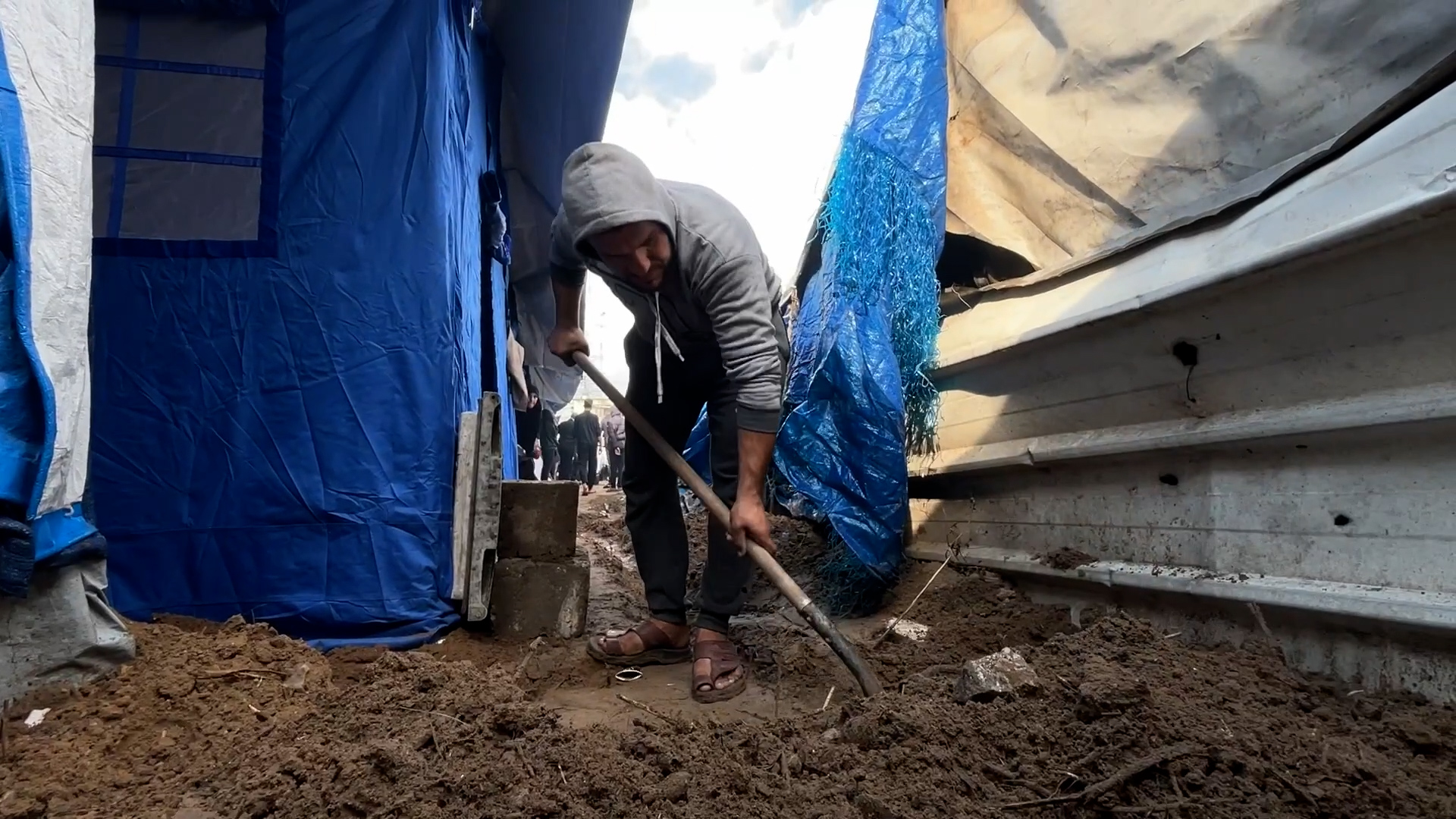 نازحون يحفرون قنوات لتصريف مياه الأمطار بغزة