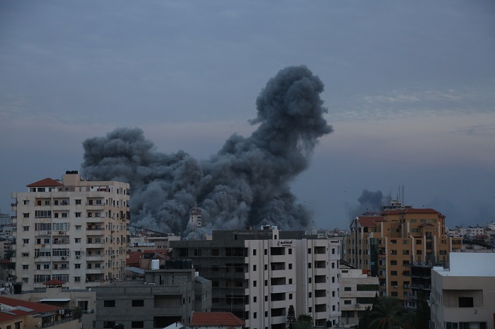 غزة 7-10-2023 وفا- دمرت طائرات الاحتلال الحربية، مساء اليوم السبت، برج فلسطين السكني في حي الرمال غرب مدينة غزة، وسوته بالأرض.
