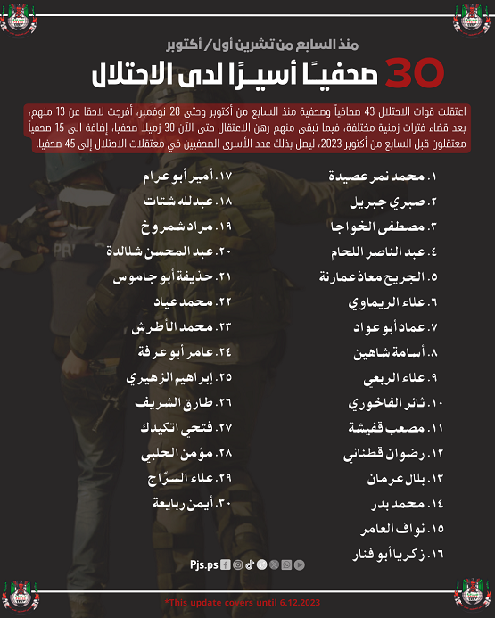 30 أسيرا صحفيا والاحتلال قصف منازل عائلات 60 صحفيا ودمر 63 مقرا إعلاميا