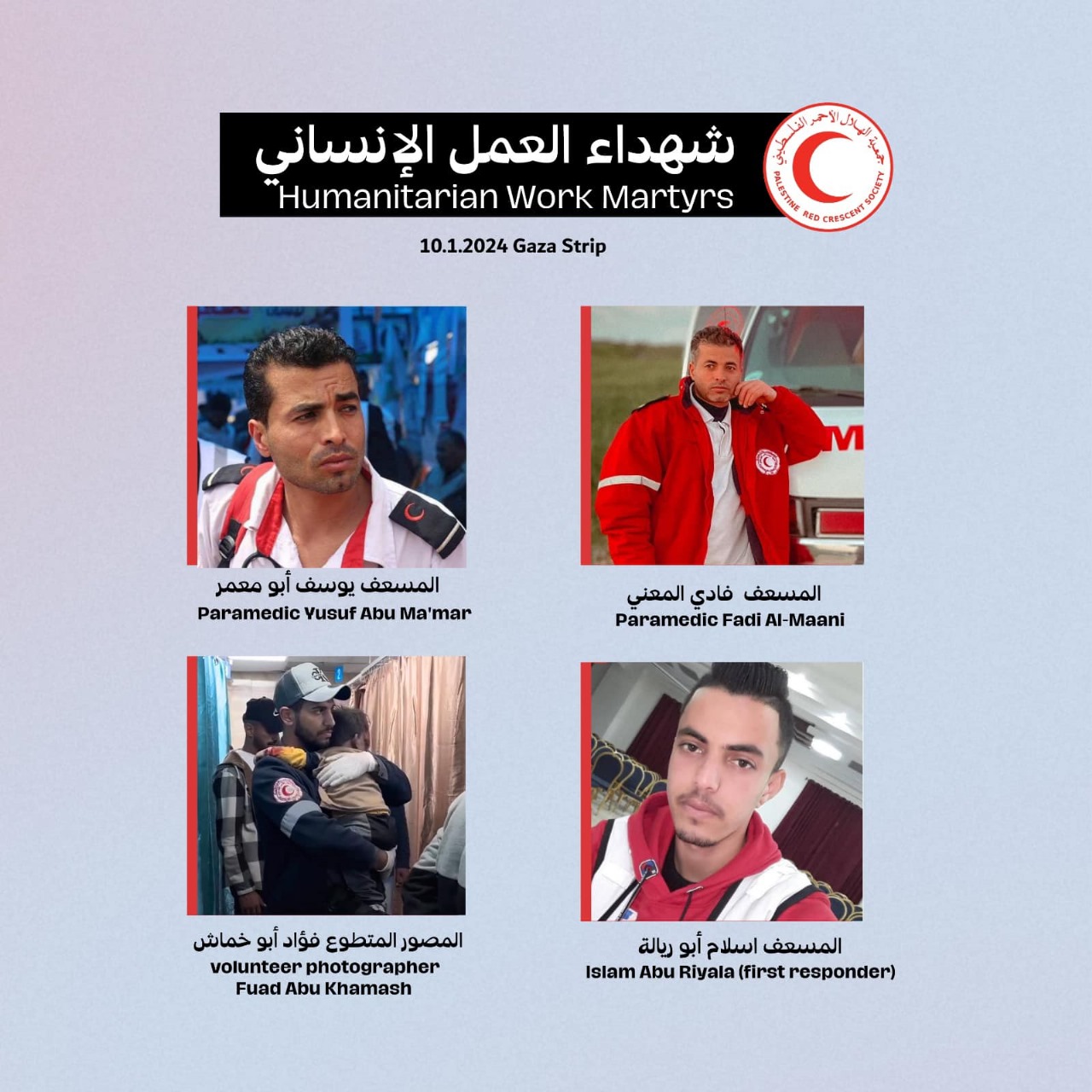 وقالت الجمعية، إن القصف أدى إلى استشهاد 6 مواطنين، بينهم 4 من طواقم الإسعاف التابعة لها وهم: سائق الإسعاف يوسف أبو معمر، والمسعف فادي فؤاد المعاني، وإسلام أبو ريالة مستجيب أول، والمصور المتطوع فؤاد أبو خماش.