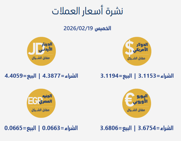 رام الله 19-2-2026 وفا- جاءت أسعار صرف العملات مقابل الشيقل الإسرائيلي، اليوم الخميس، بحسب سلطة النقد الفلسطينية، على النحو التالي: