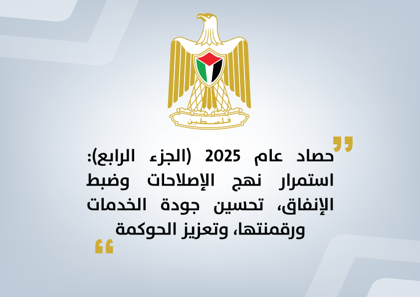 رام الله 23-3-2026 وفا- نشر مركز الاتصال الحكومي الجزء الرابع من سلسلة تقارير حصاد عام 2025 ويستعرض فيه أبرز التدخلات الحكومية التي نُفذت فعليًا خلال عام 2025 لتعزيز كفاءة الإدارة العامة والتطوير والإصلاح المؤسسي، وذلك بهدف تعزيز انتظام عمل المؤسسات العامة، وتطوير الأطر التنظيمية والتشريعية، وضمان استمرارية تقديم الخدمات، رغم التحديات السياسية والاقتصادية الراهنة.