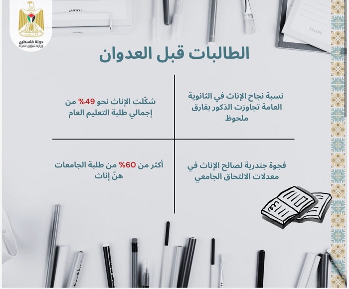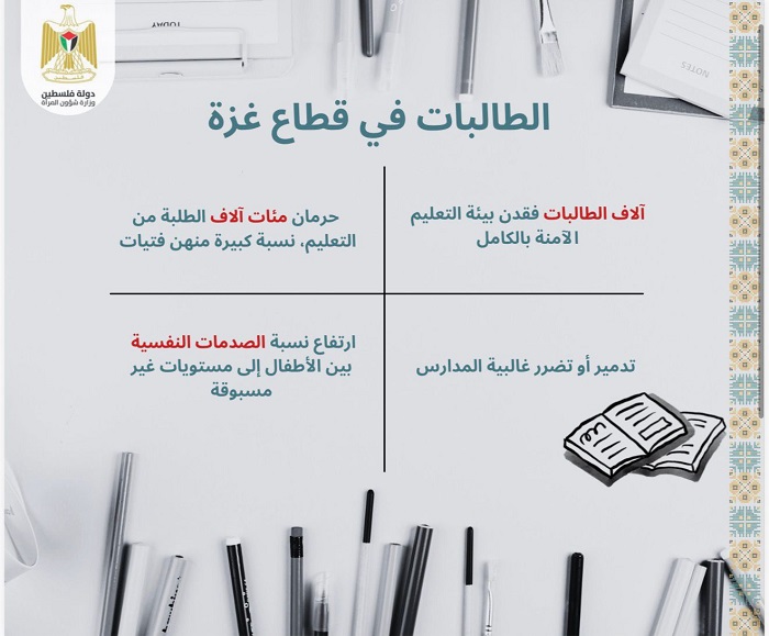 رام الله 3-3-2026 وفا- أصدرت وزارة شؤون المرأة، اليوم الثلاثاء، ورقة تحليلية بعنوان "واقع التعليم للفتيات في فلسطين (2025-2026)"، تسلط الضوء على التداعيات العميقة لحرب الإبادة على قطاع غزة والعدوان المتصاعد في الضفة الغربية بما فيها القدس، وانعكاساتهما المباشرة على حق الفتيات في التعليم الآمن والمستقر، وذلك في إطار إحياء يوم المرأة العالمي، وضمن سلسلة تقارير الرصد والتوثيق التي تصدرها الوزارة حول واقع المرأة الفلسطينية.
