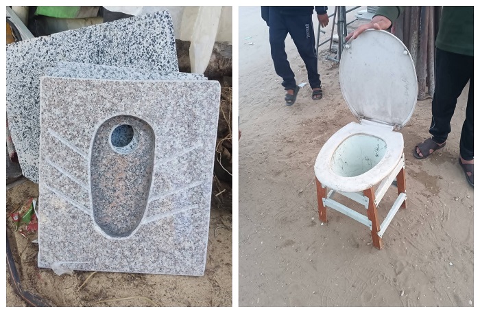 وباتت مشاهد غياب المراحيض والحمامات والمغاسل وملحقاتها واقعًا يوميًا، ما اضطر المواطنين إلى ابتكار حلول بدائية وفق إمكانياتهم المحدودة؛ فالبعض يصنع مراحيض من الإسمنت أو من بقايا حجارة المنازل المدمرة، وآخرون يستخدمون علبًا معدنية كبيرة أو يحولون كراسي عادية إلى مراحيض عبر تثبيت قواعد جلوس عليها، فيما يلجأ آخرون إلى صيانة الكراسي القديمة بمواد بسيطة لإعادة استخدامها. ورغم هذه المحاولات، تبقى المعاناة مستمرة ولا تلبي الحد الأدنى من الاحتياجات الإنسانية.