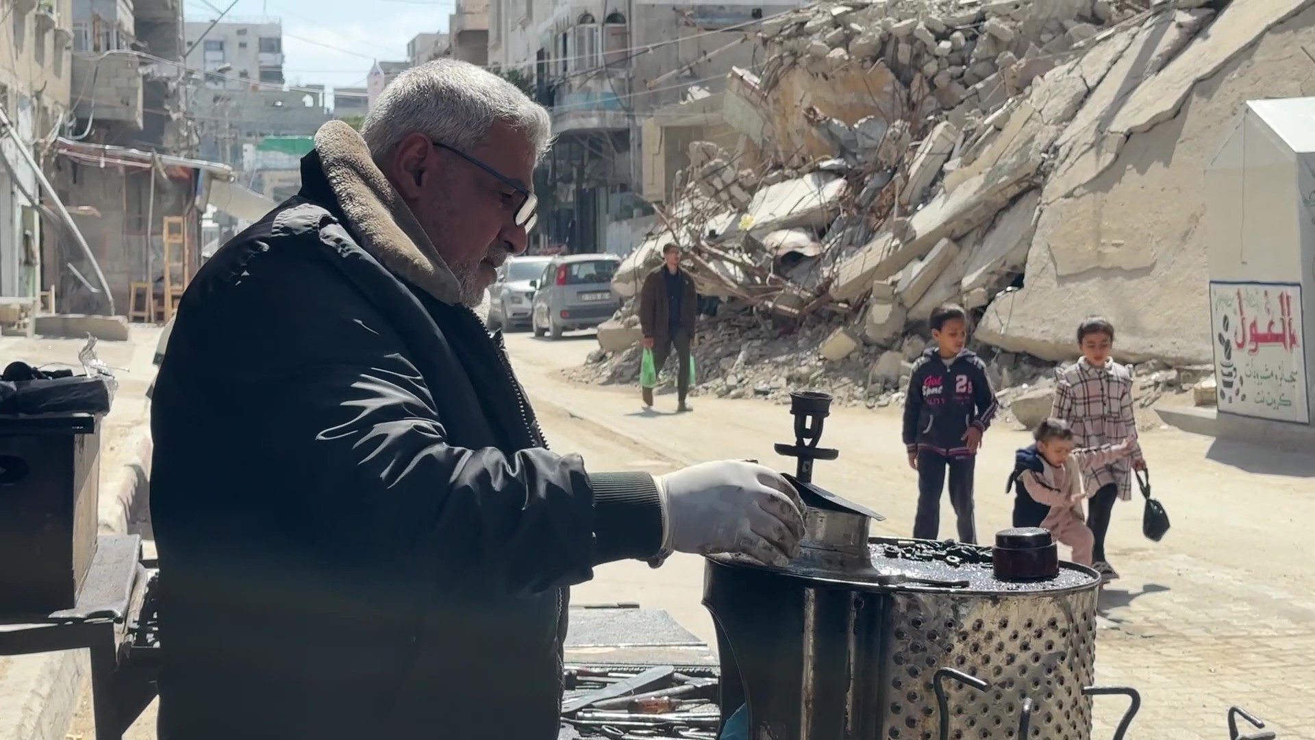 يرسم المسن الفلسطيني محمد زملط، النازح من مخيم جباليا شمالاً إلى ووسط قطاع غزة، لوحات تجسد تجربته خلال العدوان الإسرائيلي، بما في ذلك الواقع المعيشي الصعب في ومعاناته الشخصية بعد استشهاد أبنائه.